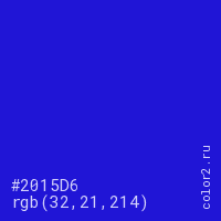 Цвет #2015D6 в цветовой модели RGB обозначается тремя октетами (32, 21, 214) в десятичном формате и #2015D6 в шестнадцатиричном (hex) формате, которые являются интенсивностью красного 32 (hex 20), интенсивность зелёного 21 (hex 15) и интенсивность синего 214 (hex D6).