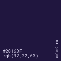 Цвет #20163F в цветовой модели RGB обозначается тремя октетами (32, 22, 63) в десятичном формате и #20163F в шестнадцатиричном (hex) формате, которые являются интенсивностью красного 32 (hex 20), интенсивность зелёного 22 (hex 16) и интенсивность синего 63 (hex 3F).