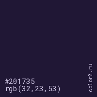 Цвет #201735 в цветовой модели RGB обозначается тремя октетами (32, 23, 53) в десятичном формате и #201735 в шестнадцатиричном (hex) формате, которые являются интенсивностью красного 32 (hex 20), интенсивность зелёного 23 (hex 17) и интенсивность синего 53 (hex 35).