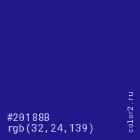 Цвет #20188B в цветовой модели RGB обозначается тремя октетами (32, 24, 139) в десятичном формате и #20188B в шестнадцатиричном (hex) формате, которые являются интенсивностью красного 32 (hex 20), интенсивность зелёного 24 (hex 18) и интенсивность синего 139 (hex 8B).