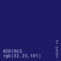 Цвет #201965 в цветовой модели RGB обозначается тремя октетами (32, 25, 101) в десятичном формате и #201965 в шестнадцатиричном (hex) формате, которые являются интенсивностью красного 32 (hex 20), интенсивность зелёного 25 (hex 19) и интенсивность синего 101 (hex 65).