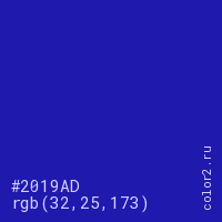 Цвет #2019AD в цветовой модели RGB обозначается тремя октетами (32, 25, 173) в десятичном формате и #2019AD в шестнадцатиричном (hex) формате, которые являются интенсивностью красного 32 (hex 20), интенсивность зелёного 25 (hex 19) и интенсивность синего 173 (hex AD).