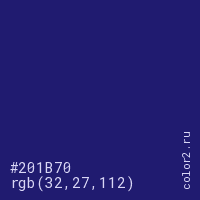 Цвет #201B70 в цветовой модели RGB обозначается тремя октетами (32, 27, 112) в десятичном формате и #201B70 в шестнадцатиричном (hex) формате, которые являются интенсивностью красного 32 (hex 20), интенсивность зелёного 27 (hex 1B) и интенсивность синего 112 (hex 70).