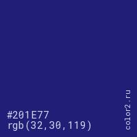 Цвет #201E77 в цветовой модели RGB обозначается тремя октетами (32, 30, 119) в десятичном формате и #201E77 в шестнадцатиричном (hex) формате, которые являются интенсивностью красного 32 (hex 20), интенсивность зелёного 30 (hex 1E) и интенсивность синего 119 (hex 77).