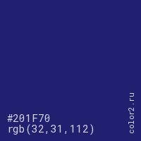 Цвет #201F70 в цветовой модели RGB обозначается тремя октетами (32, 31, 112) в десятичном формате и #201F70 в шестнадцатиричном (hex) формате, которые являются интенсивностью красного 32 (hex 20), интенсивность зелёного 31 (hex 1F) и интенсивность синего 112 (hex 70).