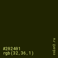 Цвет #202401 в цветовой модели RGB обозначается тремя октетами (32, 36, 1) в десятичном формате и #202401 в шестнадцатиричном (hex) формате, которые являются интенсивностью красного 32 (hex 20), интенсивность зелёного 36 (hex 24) и интенсивность синего 1 (hex 01).