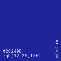 Цвет #20249B в цветовой модели RGB обозначается тремя октетами (32, 36, 155) в десятичном формате и #20249B в шестнадцатиричном (hex) формате, которые являются интенсивностью красного 32 (hex 20), интенсивность зелёного 36 (hex 24) и интенсивность синего 155 (hex 9B).