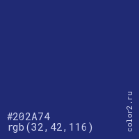 Цвет #202A74 в цветовой модели RGB обозначается тремя октетами (32, 42, 116) в десятичном формате и #202A74 в шестнадцатиричном (hex) формате, которые являются интенсивностью красного 32 (hex 20), интенсивность зелёного 42 (hex 2A) и интенсивность синего 116 (hex 74).