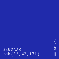 Цвет #202AAB в цветовой модели RGB обозначается тремя октетами (32, 42, 171) в десятичном формате и #202AAB в шестнадцатиричном (hex) формате, которые являются интенсивностью красного 32 (hex 20), интенсивность зелёного 42 (hex 2A) и интенсивность синего 171 (hex AB).