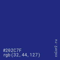 Цвет #202C7F в цветовой модели RGB обозначается тремя октетами (32, 44, 127) в десятичном формате и #202C7F в шестнадцатиричном (hex) формате, которые являются интенсивностью красного 32 (hex 20), интенсивность зелёного 44 (hex 2C) и интенсивность синего 127 (hex 7F).