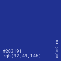 Цвет #203191 в цветовой модели RGB обозначается тремя октетами (32, 49, 145) в десятичном формате и #203191 в шестнадцатиричном (hex) формате, которые являются интенсивностью красного 32 (hex 20), интенсивность зелёного 49 (hex 31) и интенсивность синего 145 (hex 91).