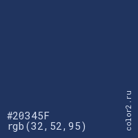 Цвет #20345F в цветовой модели RGB обозначается тремя октетами (32, 52, 95) в десятичном формате и #20345F в шестнадцатиричном (hex) формате, которые являются интенсивностью красного 32 (hex 20), интенсивность зелёного 52 (hex 34) и интенсивность синего 95 (hex 5F).
