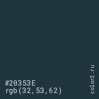 Цвет #20353E в цветовой модели RGB обозначается тремя октетами (32, 53, 62) в десятичном формате и #20353E в шестнадцатиричном (hex) формате, которые являются интенсивностью красного 32 (hex 20), интенсивность зелёного 53 (hex 35) и интенсивность синего 62 (hex 3E).