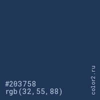 Цвет #203758 в цветовой модели RGB обозначается тремя октетами (32, 55, 88) в десятичном формате и #203758 в шестнадцатиричном (hex) формате, которые являются интенсивностью красного 32 (hex 20), интенсивность зелёного 55 (hex 37) и интенсивность синего 88 (hex 58).