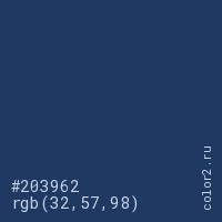 Цвет #203962 в цветовой модели RGB обозначается тремя октетами (32, 57, 98) в десятичном формате и #203962 в шестнадцатиричном (hex) формате, которые являются интенсивностью красного 32 (hex 20), интенсивность зелёного 57 (hex 39) и интенсивность синего 98 (hex 62).