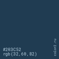 Цвет #203C52 в цветовой модели RGB обозначается тремя октетами (32, 60, 82) в десятичном формате и #203C52 в шестнадцатиричном (hex) формате, которые являются интенсивностью красного 32 (hex 20), интенсивность зелёного 60 (hex 3C) и интенсивность синего 82 (hex 52).