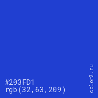 Цвет #203FD1 в цветовой модели RGB обозначается тремя октетами (32, 63, 209) в десятичном формате и #203FD1 в шестнадцатиричном (hex) формате, которые являются интенсивностью красного 32 (hex 20), интенсивность зелёного 63 (hex 3F) и интенсивность синего 209 (hex D1).