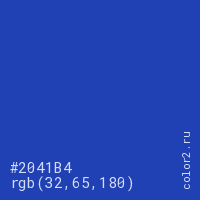 Цвет #2041B4 в цветовой модели RGB обозначается тремя октетами (32, 65, 180) в десятичном формате и #2041B4 в шестнадцатиричном (hex) формате, которые являются интенсивностью красного 32 (hex 20), интенсивность зелёного 65 (hex 41) и интенсивность синего 180 (hex B4).