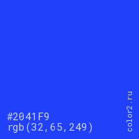 Цвет #2041F9 в цветовой модели RGB обозначается тремя октетами (32, 65, 249) в десятичном формате и #2041F9 в шестнадцатиричном (hex) формате, которые являются интенсивностью красного 32 (hex 20), интенсивность зелёного 65 (hex 41) и интенсивность синего 249 (hex F9).