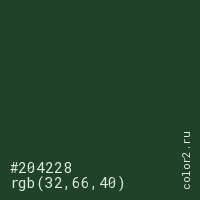 Цвет #204228 в цветовой модели RGB обозначается тремя октетами (32, 66, 40) в десятичном формате и #204228 в шестнадцатиричном (hex) формате, которые являются интенсивностью красного 32 (hex 20), интенсивность зелёного 66 (hex 42) и интенсивность синего 40 (hex 28).