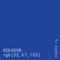 Цвет #20439B в цветовой модели RGB обозначается тремя октетами (32, 67, 155) в десятичном формате и #20439B в шестнадцатиричном (hex) формате, которые являются интенсивностью красного 32 (hex 20), интенсивность зелёного 67 (hex 43) и интенсивность синего 155 (hex 9B).