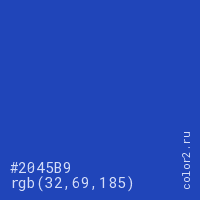 Цвет #2045B9 в цветовой модели RGB обозначается тремя октетами (32, 69, 185) в десятичном формате и #2045B9 в шестнадцатиричном (hex) формате, которые являются интенсивностью красного 32 (hex 20), интенсивность зелёного 69 (hex 45) и интенсивность синего 185 (hex B9).