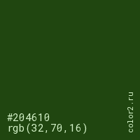 Цвет #204610 в цветовой модели RGB обозначается тремя октетами (32, 70, 16) в десятичном формате и #204610 в шестнадцатиричном (hex) формате, которые являются интенсивностью красного 32 (hex 20), интенсивность зелёного 70 (hex 46) и интенсивность синего 16 (hex 10).