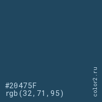 Цвет #20475F в цветовой модели RGB обозначается тремя октетами (32, 71, 95) в десятичном формате и #20475F в шестнадцатиричном (hex) формате, которые являются интенсивностью красного 32 (hex 20), интенсивность зелёного 71 (hex 47) и интенсивность синего 95 (hex 5F).