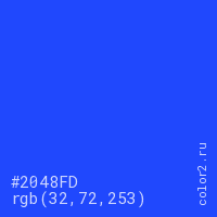 Цвет #2048FD в цветовой модели RGB обозначается тремя октетами (32, 72, 253) в десятичном формате и #2048FD в шестнадцатиричном (hex) формате, которые являются интенсивностью красного 32 (hex 20), интенсивность зелёного 72 (hex 48) и интенсивность синего 253 (hex FD).