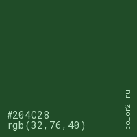 Цвет #204C28 в цветовой модели RGB обозначается тремя октетами (32, 76, 40) в десятичном формате и #204C28 в шестнадцатиричном (hex) формате, которые являются интенсивностью красного 32 (hex 20), интенсивность зелёного 76 (hex 4C) и интенсивность синего 40 (hex 28).