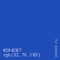 Цвет #204CB7 в цветовой модели RGB обозначается тремя октетами (32, 76, 183) в десятичном формате и #204CB7 в шестнадцатиричном (hex) формате, которые являются интенсивностью красного 32 (hex 20), интенсивность зелёного 76 (hex 4C) и интенсивность синего 183 (hex B7).