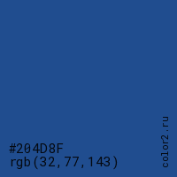 Цвет #204D8F в цветовой модели RGB обозначается тремя октетами (32, 77, 143) в десятичном формате и #204D8F в шестнадцатиричном (hex) формате, которые являются интенсивностью красного 32 (hex 20), интенсивность зелёного 77 (hex 4D) и интенсивность синего 143 (hex 8F).