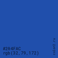 Цвет #204FAC в цветовой модели RGB обозначается тремя октетами (32, 79, 172) в десятичном формате и #204FAC в шестнадцатиричном (hex) формате, которые являются интенсивностью красного 32 (hex 20), интенсивность зелёного 79 (hex 4F) и интенсивность синего 172 (hex AC).