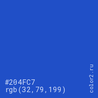 Цвет #204FC7 в цветовой модели RGB обозначается тремя октетами (32, 79, 199) в десятичном формате и #204FC7 в шестнадцатиричном (hex) формате, которые являются интенсивностью красного 32 (hex 20), интенсивность зелёного 79 (hex 4F) и интенсивность синего 199 (hex C7).