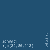 Цвет #205071 в цветовой модели RGB обозначается тремя октетами (32, 80, 113) в десятичном формате и #205071 в шестнадцатиричном (hex) формате, которые являются интенсивностью красного 32 (hex 20), интенсивность зелёного 80 (hex 50) и интенсивность синего 113 (hex 71).
