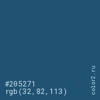 Цвет #205271 в цветовой модели RGB обозначается тремя октетами (32, 82, 113) в десятичном формате и #205271 в шестнадцатиричном (hex) формате, которые являются интенсивностью красного 32 (hex 20), интенсивность зелёного 82 (hex 52) и интенсивность синего 113 (hex 71).
