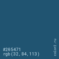Цвет #205471 в цветовой модели RGB обозначается тремя октетами (32, 84, 113) в десятичном формате и #205471 в шестнадцатиричном (hex) формате, которые являются интенсивностью красного 32 (hex 20), интенсивность зелёного 84 (hex 54) и интенсивность синего 113 (hex 71).