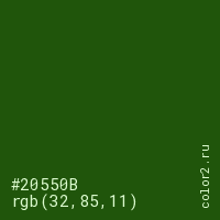 Цвет #20550B в цветовой модели RGB обозначается тремя октетами (32, 85, 11) в десятичном формате и #20550B в шестнадцатиричном (hex) формате, которые являются интенсивностью красного 32 (hex 20), интенсивность зелёного 85 (hex 55) и интенсивность синего 11 (hex 0B).