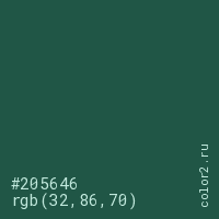 Цвет #205646 в цветовой модели RGB обозначается тремя октетами (32, 86, 70) в десятичном формате и #205646 в шестнадцатиричном (hex) формате, которые являются интенсивностью красного 32 (hex 20), интенсивность зелёного 86 (hex 56) и интенсивность синего 70 (hex 46).