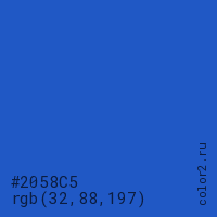 Цвет #2058C5 в цветовой модели RGB обозначается тремя октетами (32, 88, 197) в десятичном формате и #2058C5 в шестнадцатиричном (hex) формате, которые являются интенсивностью красного 32 (hex 20), интенсивность зелёного 88 (hex 58) и интенсивность синего 197 (hex C5).