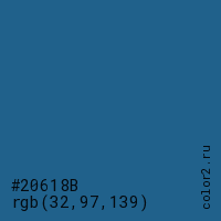 Цвет #20618B в цветовой модели RGB обозначается тремя октетами (32, 97, 139) в десятичном формате и #20618B в шестнадцатиричном (hex) формате, которые являются интенсивностью красного 32 (hex 20), интенсивность зелёного 97 (hex 61) и интенсивность синего 139 (hex 8B).
