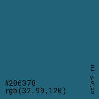 Цвет #206378 в цветовой модели RGB обозначается тремя октетами (32, 99, 120) в десятичном формате и #206378 в шестнадцатиричном (hex) формате, которые являются интенсивностью красного 32 (hex 20), интенсивность зелёного 99 (hex 63) и интенсивность синего 120 (hex 78).