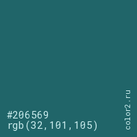 Цвет #206569 в цветовой модели RGB обозначается тремя октетами (32, 101, 105) в десятичном формате и #206569 в шестнадцатиричном (hex) формате, которые являются интенсивностью красного 32 (hex 20), интенсивность зелёного 101 (hex 65) и интенсивность синего 105 (hex 69).