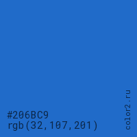 Цвет #206BC9 в цветовой модели RGB обозначается тремя октетами (32, 107, 201) в десятичном формате и #206BC9 в шестнадцатиричном (hex) формате, которые являются интенсивностью красного 32 (hex 20), интенсивность зелёного 107 (hex 6B) и интенсивность синего 201 (hex C9).