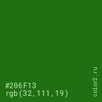 Цвет #206F13 в цветовой модели RGB обозначается тремя октетами (32, 111, 19) в десятичном формате и #206F13 в шестнадцатиричном (hex) формате, которые являются интенсивностью красного 32 (hex 20), интенсивность зелёного 111 (hex 6F) и интенсивность синего 19 (hex 13).