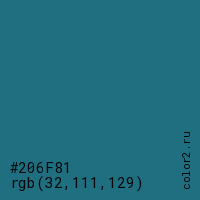 Цвет #206F81 в цветовой модели RGB обозначается тремя октетами (32, 111, 129) в десятичном формате и #206F81 в шестнадцатиричном (hex) формате, которые являются интенсивностью красного 32 (hex 20), интенсивность зелёного 111 (hex 6F) и интенсивность синего 129 (hex 81).