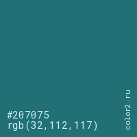 Цвет #207075 в цветовой модели RGB обозначается тремя октетами (32, 112, 117) в десятичном формате и #207075 в шестнадцатиричном (hex) формате, которые являются интенсивностью красного 32 (hex 20), интенсивность зелёного 112 (hex 70) и интенсивность синего 117 (hex 75).