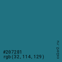 Цвет #207281 в цветовой модели RGB обозначается тремя октетами (32, 114, 129) в десятичном формате и #207281 в шестнадцатиричном (hex) формате, которые являются интенсивностью красного 32 (hex 20), интенсивность зелёного 114 (hex 72) и интенсивность синего 129 (hex 81).