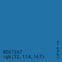 Цвет #2072A7 в цветовой модели RGB обозначается тремя октетами (32, 114, 167) в десятичном формате и #2072A7 в шестнадцатиричном (hex) формате, которые являются интенсивностью красного 32 (hex 20), интенсивность зелёного 114 (hex 72) и интенсивность синего 167 (hex A7).