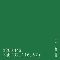 Цвет #207443 в цветовой модели RGB обозначается тремя октетами (32, 116, 67) в десятичном формате и #207443 в шестнадцатиричном (hex) формате, которые являются интенсивностью красного 32 (hex 20), интенсивность зелёного 116 (hex 74) и интенсивность синего 67 (hex 43).
